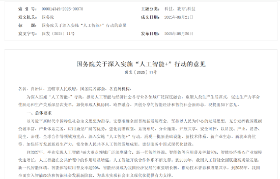8月26日,国务院发布《关于深入实施“人工智能+”行动的意见》,明确提出以科技、产业、消费、民生、治理、全球合作等领域为重点,推动人工智能与经济社会各行业各领域广泛深度融合。