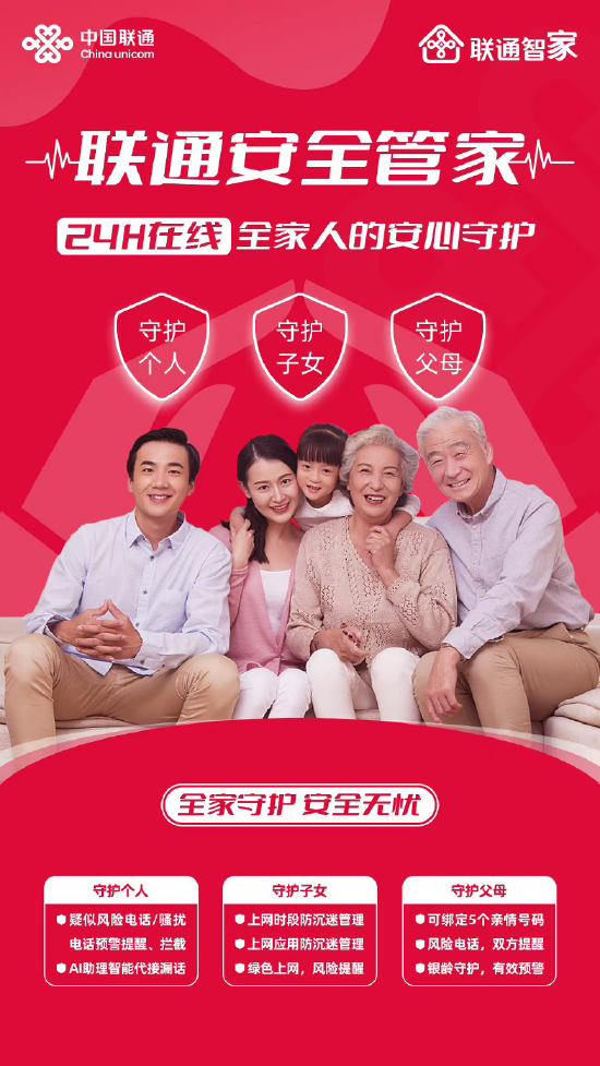 正是这些“一老一少一特”群体所面临的民生痛点,推动中国联通打造了“联通安全管家”——它不仅具备精准及时的防骚扰拦截服务,更是一款覆盖通话、短信、亲情守护、手机与宽带上网管理五大场景的一体化安全产品,致力于全方位守护家庭信息安全,让科技发展的成果更好地惠及老年人、儿童和残障人士等需要特殊关注的群体。