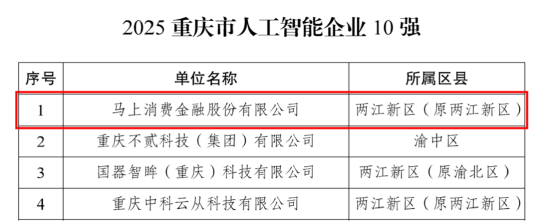 近日,重庆市软件行业协会正式发布《2025重庆市人工智能企业10强》榜单。凭借在金融科技领域的深厚积淀与大模型技术的创新突破,马上消费金融股份有限公司(以下简称“马上消费”)从众多参评企业中脱颖而出,位列榜单第一名。