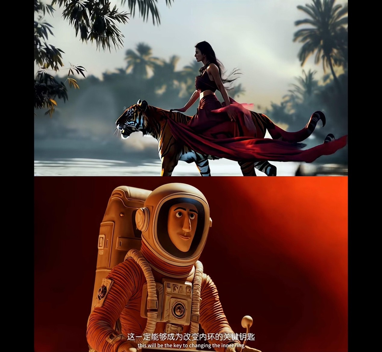 此外,借助可灵AI高效生成的多场景、多风格的画面,也为短片提供了丰富的视觉呈现。《桃源》中从写实的历史场景到奇幻的虚拟空间的切换,鲜明的对比带来了强烈的视觉冲击。《虎与旅行者那尚未举行的婚礼》通过精准调控风格比例,定制化呈现具备独特质感的美学风格,对不同光线的运用尝试以及天气的视觉尝试,辅助情感和叙事的表达。