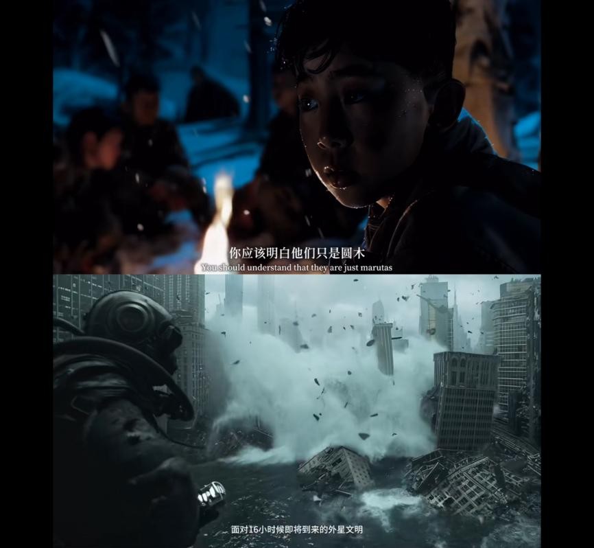 以二战日军731部队为背景创作的《圆木》,以小男孩的视角切入揭露战争暴行,反思人性在极端环境下的异化,创新的叙事角度将历史的伤痛鲜活地展现在观众面前。科幻短片《我在犹豫》融合了人工智能、外星危机、太阳坍塌等科幻元素,通过写实的视觉、深刻的台词和存在主义命题,探讨AI时代的技术边界与生命意义,区别于传统 AI 科幻题材的“油腻感”,短片用克制且真实的画面呈现代入感与压迫感。