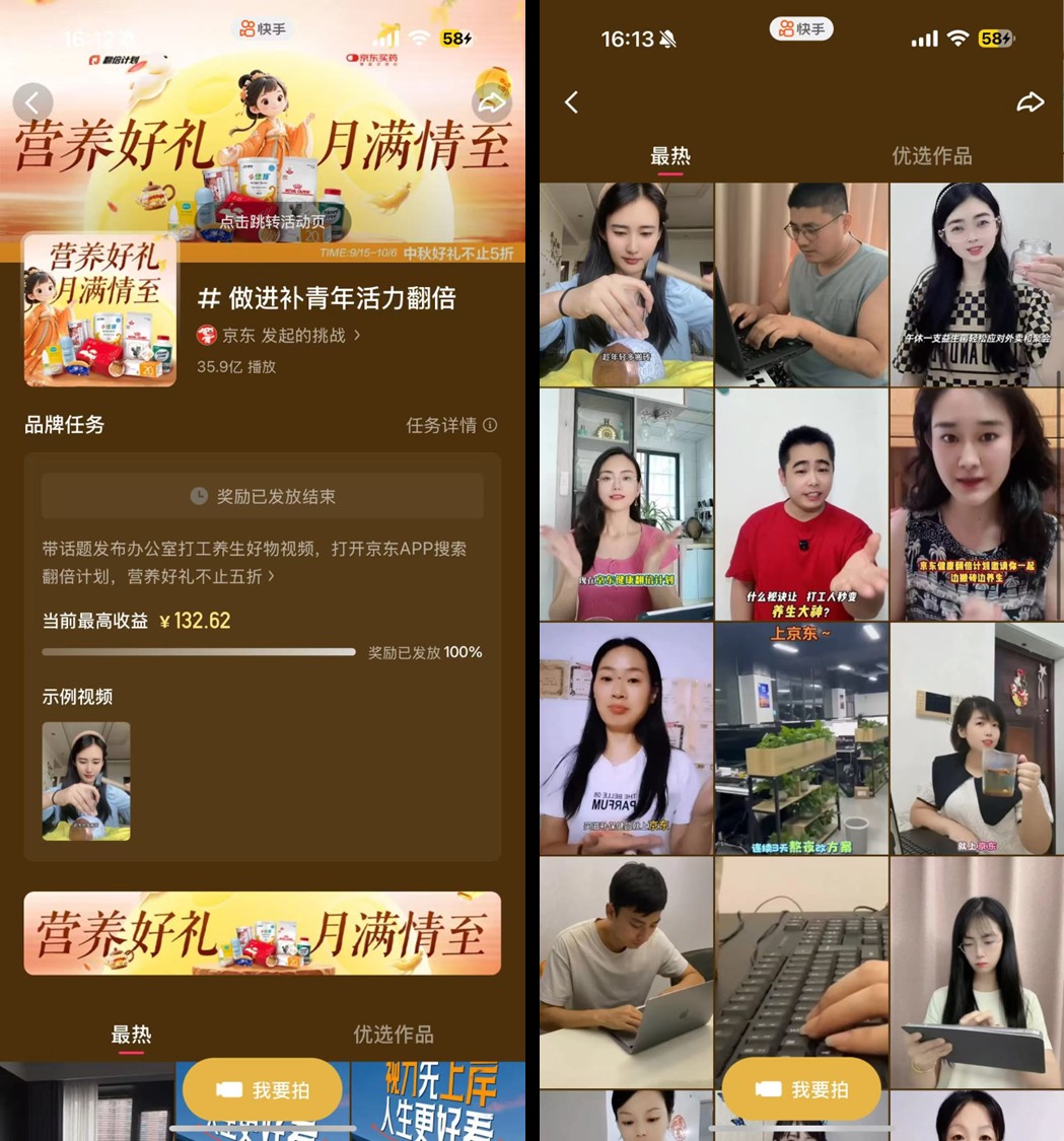京东好营养在快手发起#做进补青年活力翻倍#话题挑战赛,快速引爆UGC势能:用户只需带话题发布办公室养生好物视频,即可参与互动,真实场景、真实安利引发真实种草,截至目前,UGC社交裂变已产生近36亿播放的巨量传播。