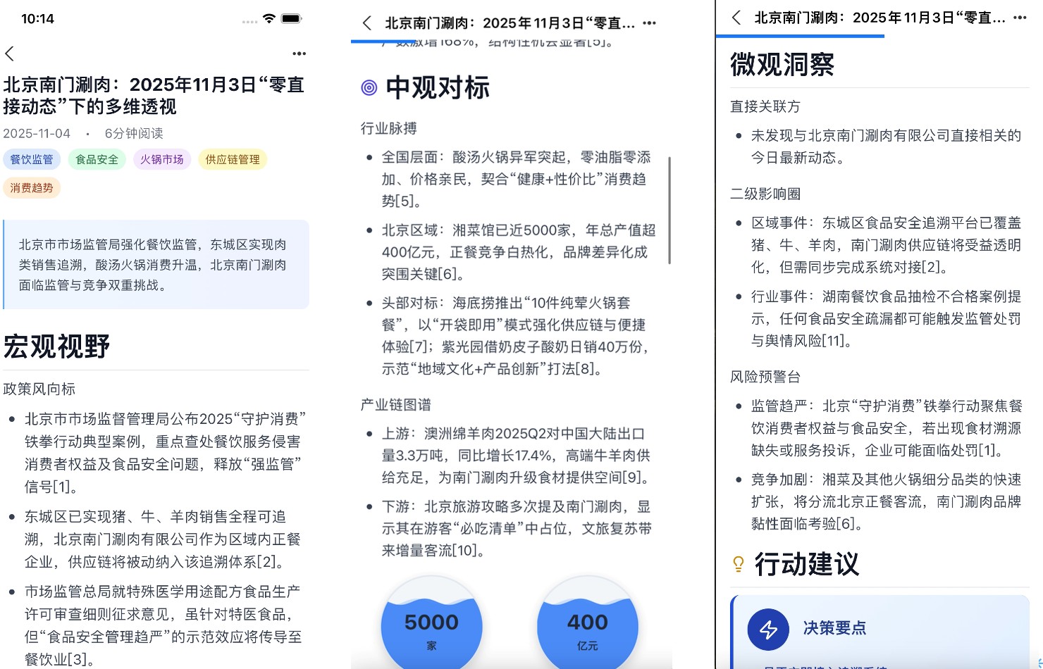 在杭州经营着8家门店的川菜馆老板李先生,成了“AI商情快报”的首批使用者。“以前每天都得抽出大量时间看新闻和公众号,效率低还焦虑。”李先生坦言,“现在打开支付宝就能查看报告,不光告诉我‘发生了什么’,还会分析‘这意味着什么’,让我能有专注于门店管理和客户服务。”