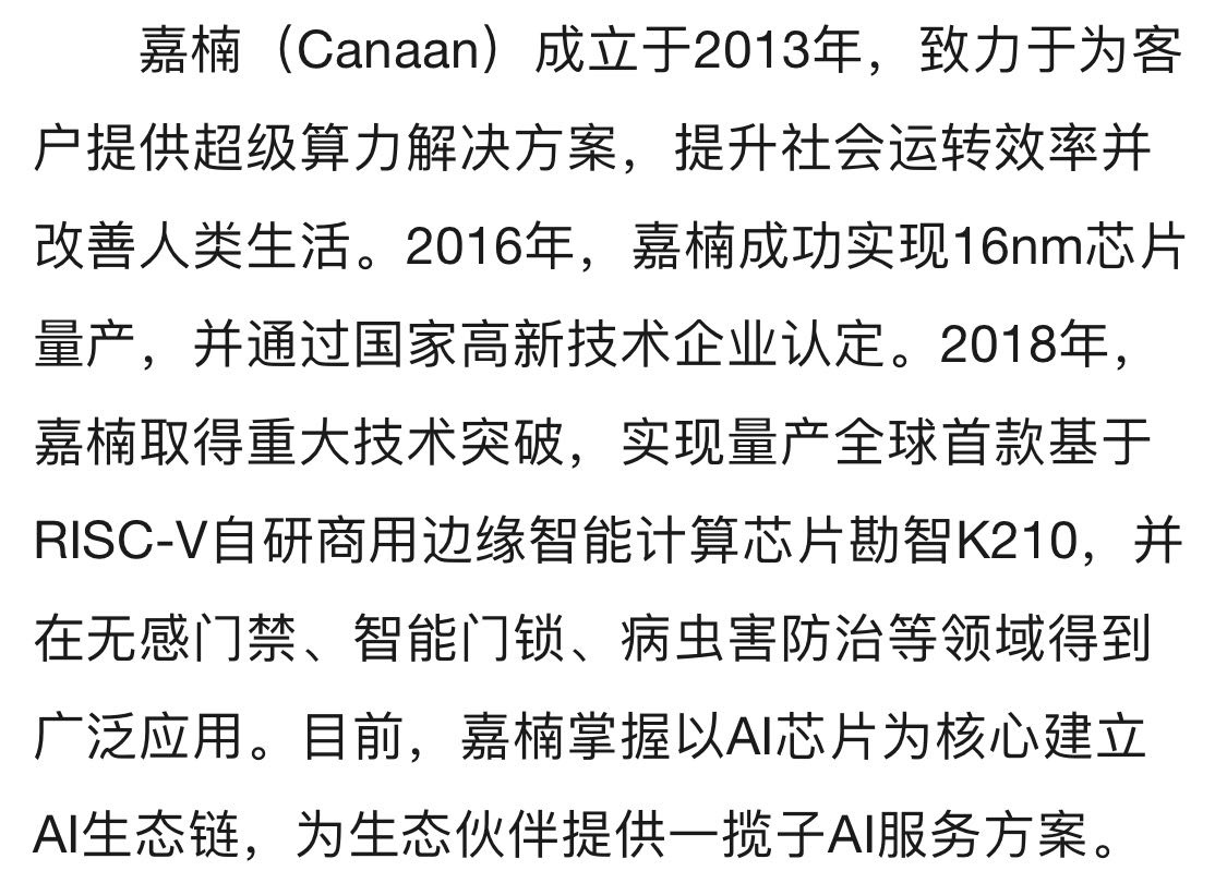嘉楠Canaan凭借勘智K210荣获2019“中国芯”优秀技术创新产品称号,芯片具备自主IP、视听兼具与可编程能力三大特点,能够充分适配多个业务场景的需求。[详情]